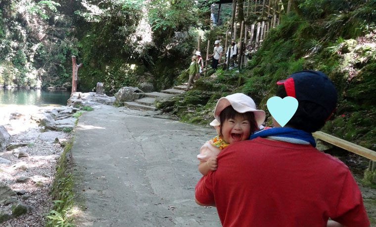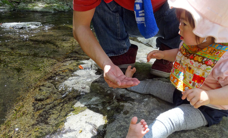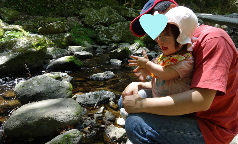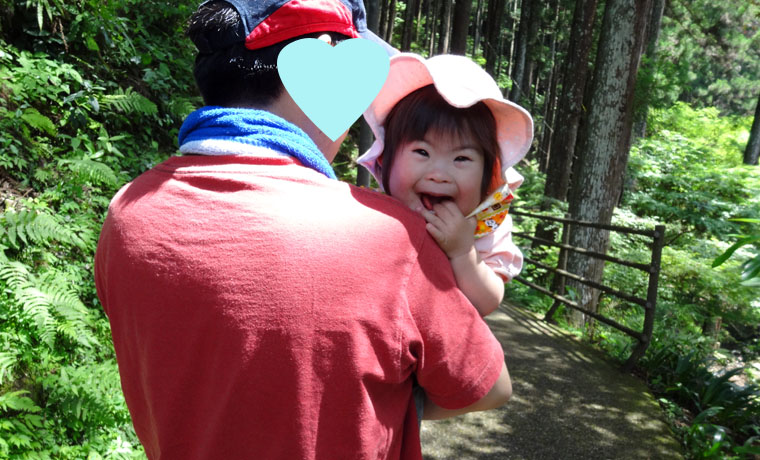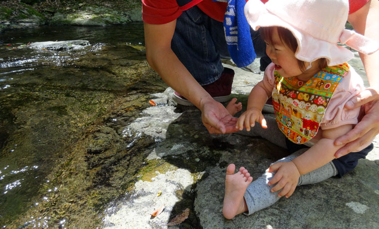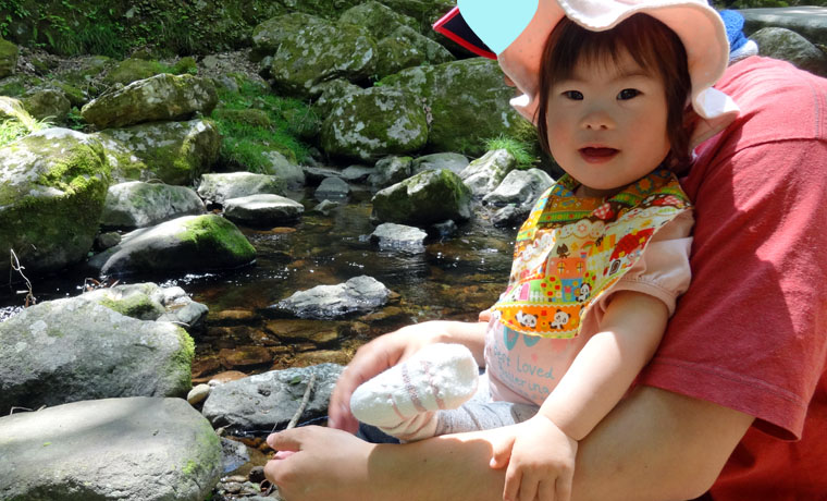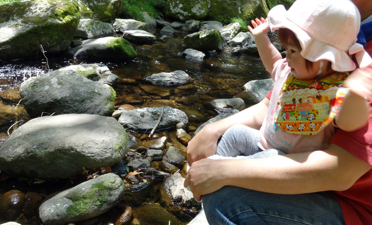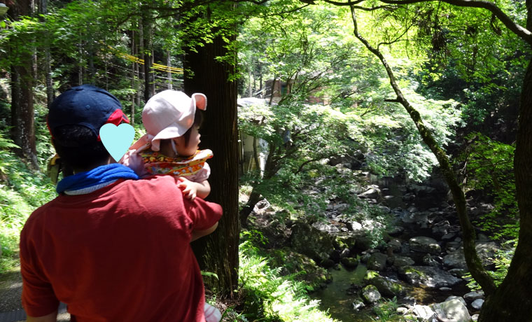 生後5カ月目に訪れて以来、2回目の赤目滝です。娘はすごく嬉しそうにしていました。生後間もない頃から自然の中に頻繁に連れていくうちに好きになったのでしょうか。