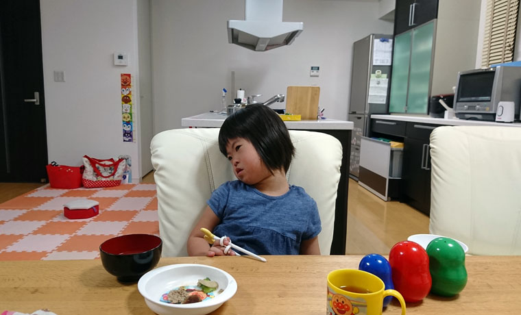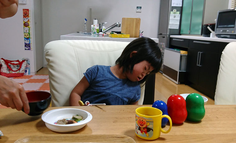 今日は午前中、スイミングで疲れてしまったのか、娘は早めの夕食中に椅子に座ったまま寝てしまいました。