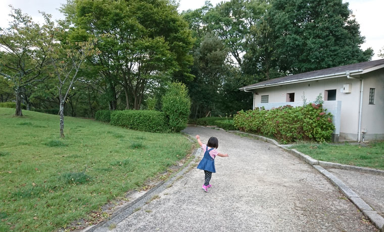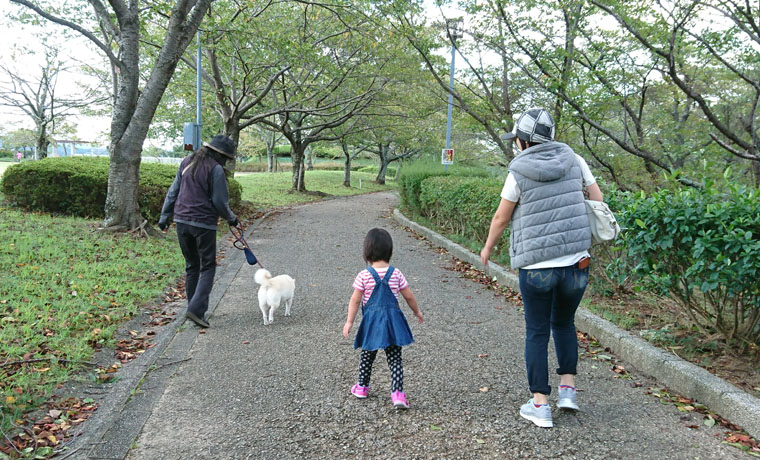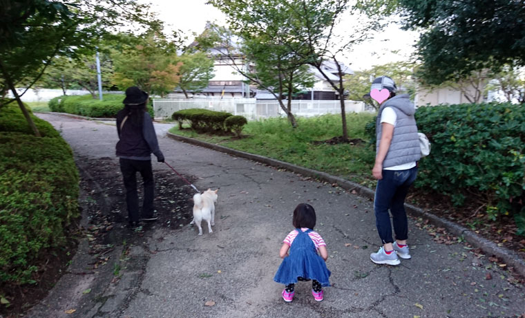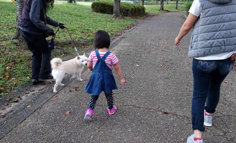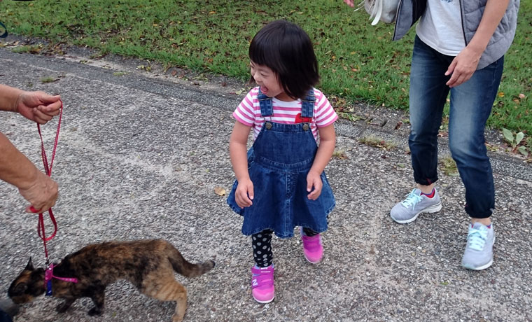 犬と猫がいて、娘は嬉しそうに近づいていきました。娘があまりにも嬉しそうにしていたので、犬を散歩している方が私たち家族と一緒に散歩してくれました。500メートルくらいの距離でしょうか。ノンストップで歩くことができました。