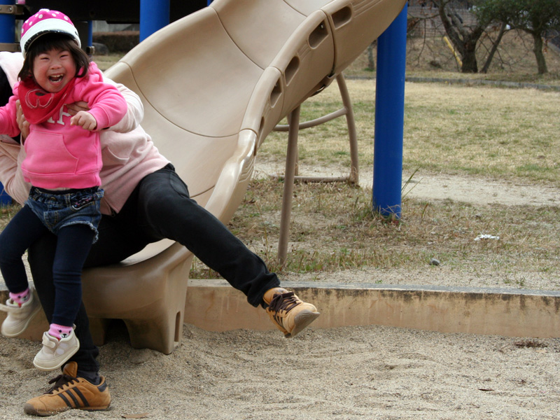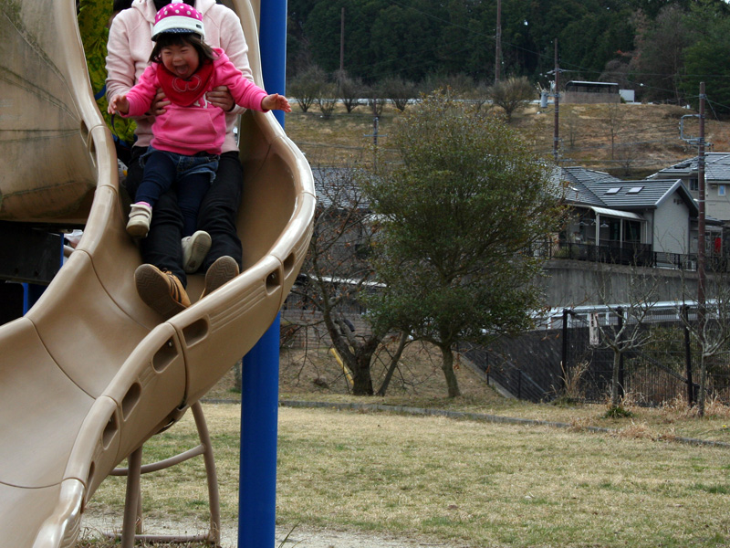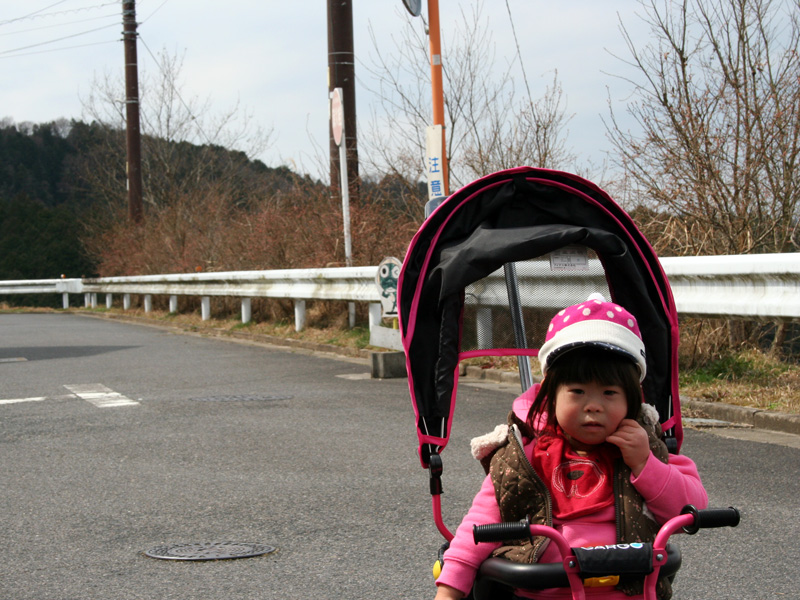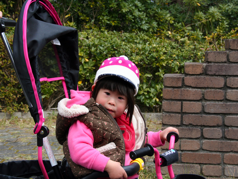 少し暖かくなってきました。桜の花が咲いていないか探しに三輪車に乗って近所を散歩に。 帰りは公園の滑り台で遊びました。