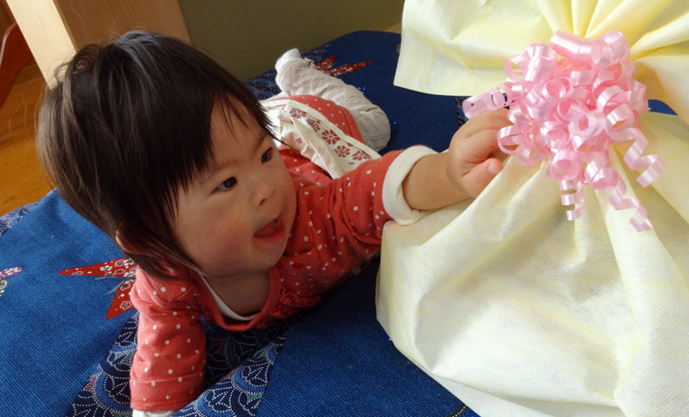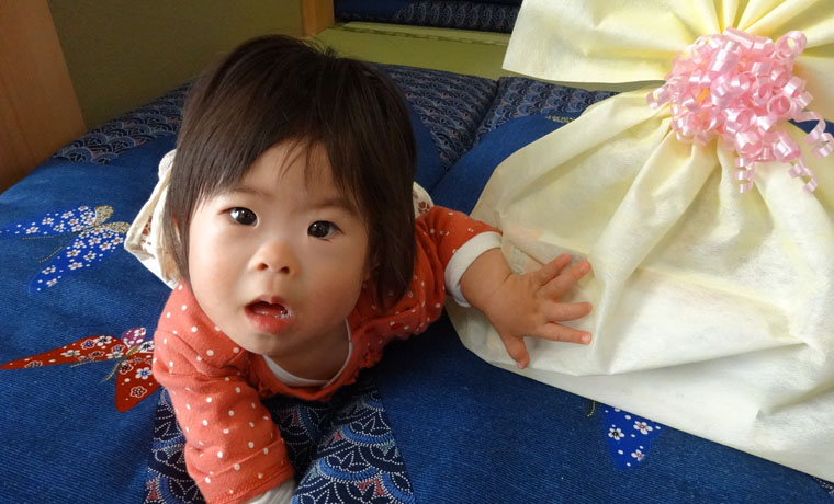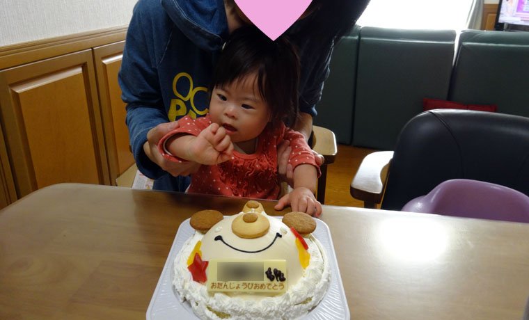 おばあちゃんの家で1歳の誕生日パーティーをしました。最高の笑顔を見せてくれています。