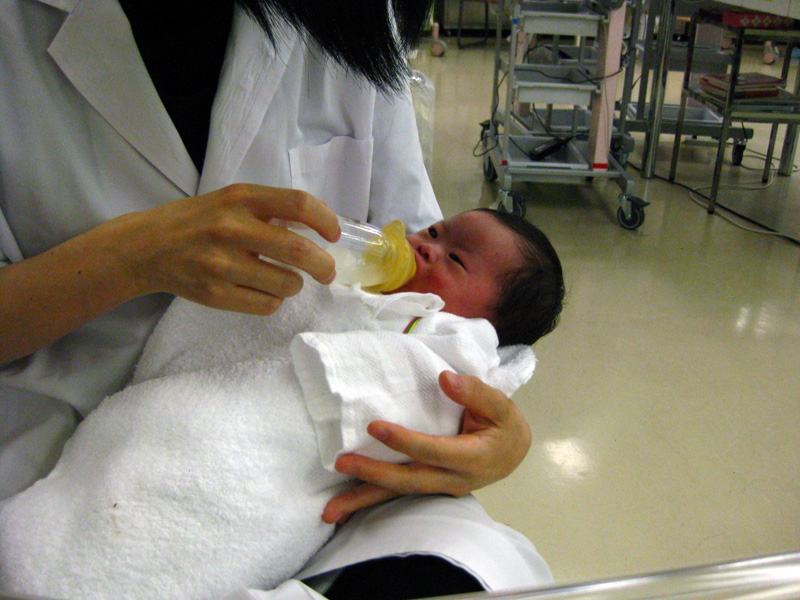 NICUではじめての入浴後、ミルクをあげました。